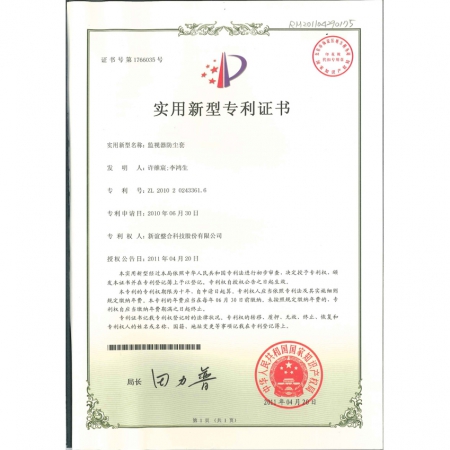 取得中國大陸「監視器防塵套」實用新型專利證書